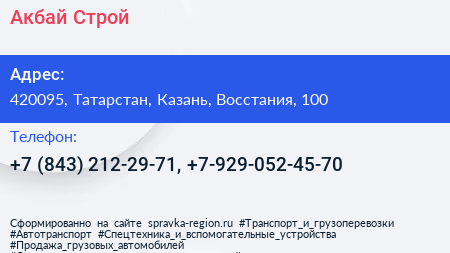 Акбай Строй по адресу 420095, Татарстан, Казань, Восстания, 100 в дальнейшем Организация, размещена в следующих категориях: