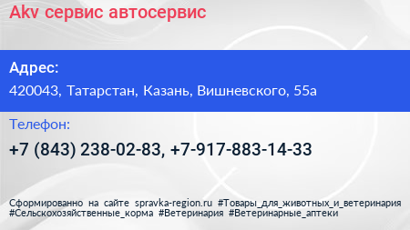 Akv сервис, автосервис по адресу 420043, Татарстан, Казань, Вишневского, 55а в дальнейшем Организация, размещена в следующих категориях: