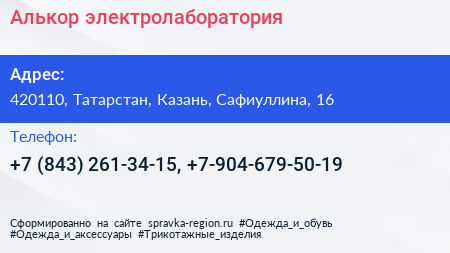 Алькор, электролаборатория по адресу 420110, Татарстан, Казань, Сафиуллина, 16 в дальнейшем Организация, размещена в следующих категориях: