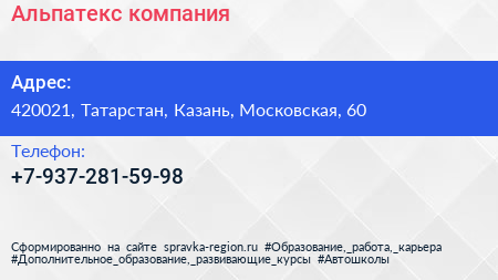Альпатекс, компания по адресу 420021, Татарстан, Казань, Московская, 60 в дальнейшем Организация, размещена в следующих категориях: