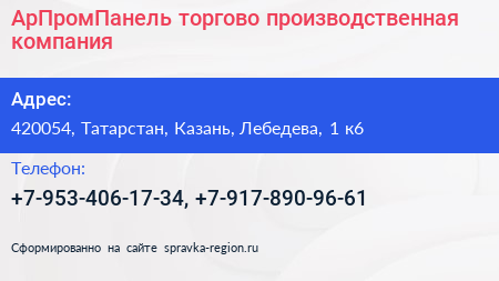 АрПромПанель, торгово-производственная компания по адресу 420054, Татарстан, Казань, Лебедева, 1 к6 в дальнейшем Организация, размещена в следующих категориях: