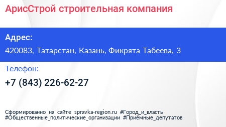АрисСтрой, строительная компания по адресу 420083, Татарстан, Казань, Фикрята Табеева, 3 в дальнейшем Организация, размещена в следующих категориях: