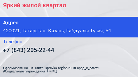 Яркий, жилой квартал по адресу 420021, Татарстан, Казань, Габдуллы Тукая, 64 в дальнейшем Организация, размещена в следующих категориях: