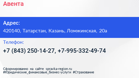 Авента по адресу 420140, Татарстан, Казань, Ломжинская, 20а в дальнейшем Организация, размещена в следующих категориях: