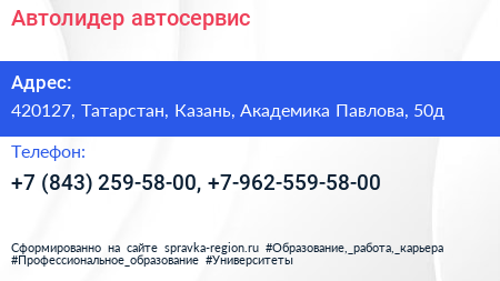 Автолидер, автосервис по адресу 420127, Татарстан, Казань, Академика Павлова, 50д в дальнейшем Организация, размещена в следующих категориях: