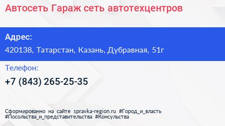 Автосеть Гараж, сеть автотехцентров по адресу 420138, Татарстан, Казань, Дубравная, 51г в дальнейшем Организация, размещена в следующих категориях: