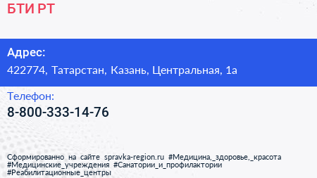 БТИ РТ по адресу 422774, Татарстан, Казань, Центральная, 1а в дальнейшем Организация, размещена в следующих категориях: