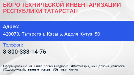 БЮРО ТЕХНИЧЕСКОЙ ИНВЕНТАРИЗАЦИИ РЕСПУБЛИКИ ТАТАРСТАН по адресу 420073, Татарстан, Казань, Аделя Кутуя, 50 в дальнейшем Организация, размещена в следующих категориях:
