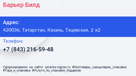 Барьер Билд по адресу 420036, Татарстан, Казань, Тэцевская, 2 к2 в дальнейшем Организация, размещена в следующих категориях: