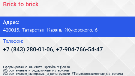 Brick to brick по адресу 420015, Татарстан, Казань, Жуковского, 6 в дальнейшем Организация, размещена в следующих категориях: