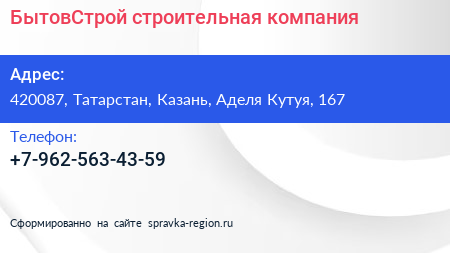БытовСтрой, строительная компания по адресу 420087, Татарстан, Казань, Аделя Кутуя, 167 в дальнейшем Организация, размещена в следующих категориях: