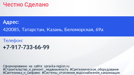 Честно Сделано по адресу 420085, Татарстан, Казань, Беломорская, 69а в дальнейшем Организация, размещена в следующих категориях: