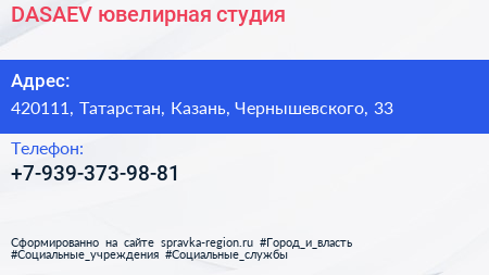 DASAEV, ювелирная студия по адресу 420111, Татарстан, Казань, Чернышевского, 33 в дальнейшем Организация, размещена в следующих категориях: