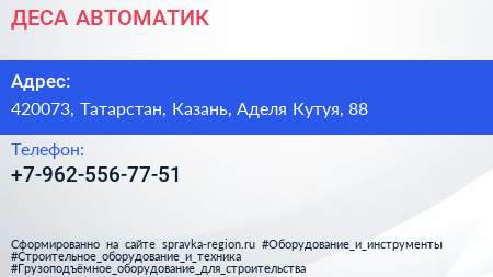 ДЕСА АВТОМАТИК по адресу 420073, Татарстан, Казань, Аделя Кутуя, 88 в дальнейшем Организация, размещена в следующих категориях: