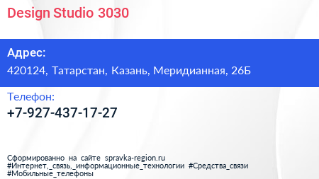 Design Studio 3030 по адресу 420124, Татарстан, Казань, Меридианная, 26Б в дальнейшем Организация, размещена в следующих категориях: