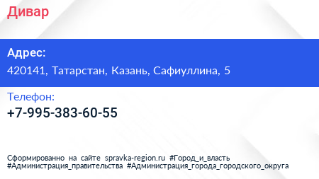 Дивар по адресу 420141, Татарстан, Казань, Сафиуллина, 5 в дальнейшем Организация, размещена в следующих категориях: