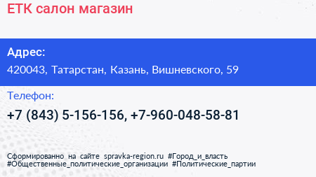 ЕТК, салон-магазин по адресу 420043, Татарстан, Казань, Вишневского, 59 в дальнейшем Организация, размещена в следующих категориях: