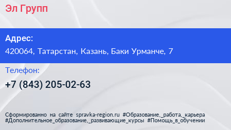 Эл-Групп по адресу 420064, Татарстан, Казань, Баки Урманче, 7 в дальнейшем Организация, размещена в следующих категориях:
