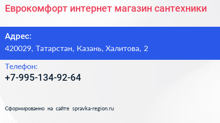 Еврокомфорт, интернет-магазин сантехники по адресу 420029, Татарстан, Казань, Халитова, 2 в дальнейшем Организация, размещена в следующих категориях: