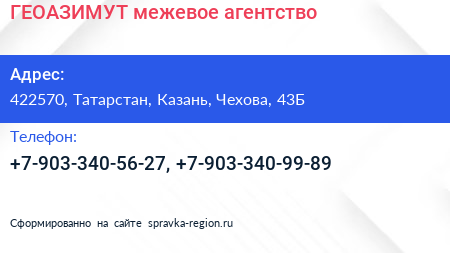 ГЕОАЗИМУТ, межевое агентство по адресу 422570, Татарстан, Казань, Чехова, 43Б в дальнейшем Организация, размещена в следующих категориях: