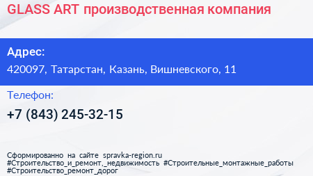 GLASS ART, производственная компания по адресу 420097, Татарстан, Казань, Вишневского, 11 в дальнейшем Организация, размещена в следующих категориях: