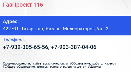ГазПроект-116 по адресу 422701, Татарстан, Казань, Мелиораторов, 9а к2 в дальнейшем Организация, размещена в следующих категориях: