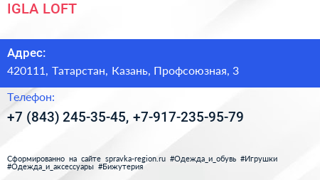 IGLA LOFT по адресу 420111, Татарстан, Казань, Профсоюзная, 3 в дальнейшем Организация, размещена в следующих категориях: