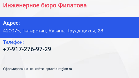 Инженерное бюро Филатова по адресу 420075, Татарстан, Казань, Трудящихся, 28 в дальнейшем Организация, размещена в следующих категориях: