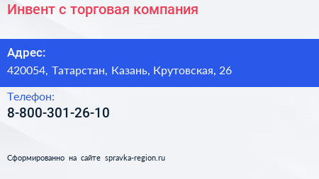 Инвент-с, торговая компания по адресу 420054, Татарстан, Казань, Крутовская, 26 в дальнейшем Организация, размещена в следующих категориях: