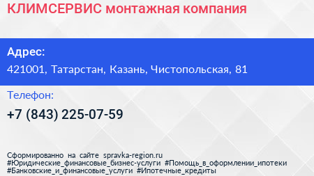 КЛИМСЕРВИС, монтажная компания по адресу 421001, Татарстан, Казань, Чистопольская, 81 в дальнейшем Организация, размещена в следующих категориях: