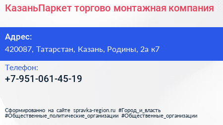 КазаньПаркет, торгово-монтажная компания по адресу 420087, Татарстан, Казань, Родины, 2а к7 в дальнейшем Организация, размещена в следующих категориях: