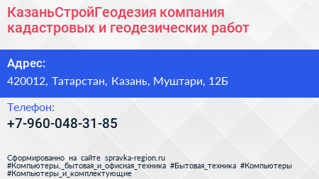 КазаньСтройГеодезия, компания кадастровых и геодезических работ по адресу 420012, Татарстан, Казань, Муштари, 12Б в дальнейшем Организация, размещена в следующих категориях: