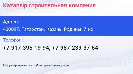 Kazansip, строительная компания по адресу 420087, Татарстан, Казань, Родины, 7 к6 в дальнейшем Организация, размещена в следующих категориях: