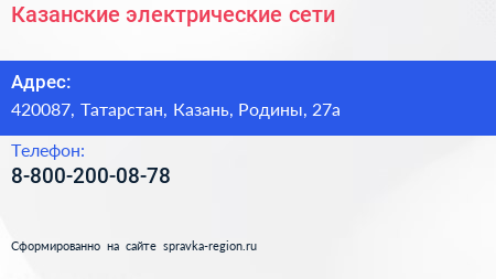 Казанские электрические сети по адресу 420087, Татарстан, Казань, Родины, 27а в дальнейшем Организация, размещена в следующих категориях: