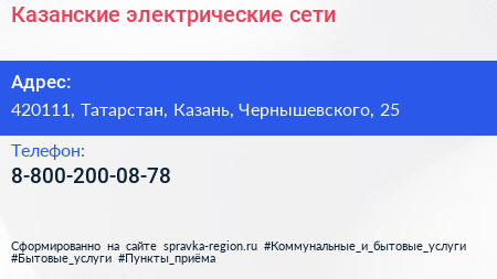 Казанские электрические сети по адресу 420111, Татарстан, Казань, Чернышевского, 25 в дальнейшем Организация, размещена в следующих категориях: