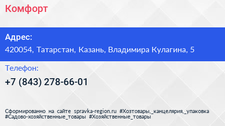 Комфорт по адресу 420054, Татарстан, Казань, Владимира Кулагина, 5 в дальнейшем Организация, размещена в следующих категориях: