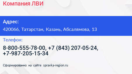 Компания ЛВИ по адресу 420066, Татарстан, Казань, Абсалямова, 13 в дальнейшем Организация, размещена в следующих категориях: