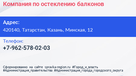 Компания по остеклению балконов по адресу 420140, Татарстан, Казань, Минская, 12 в дальнейшем Организация, размещена в следующих категориях: