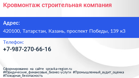 Кровмонтаж, строительная компания по адресу 420100, Татарстан, Казань, проспект Победы, 139 к3 в дальнейшем Организация, размещена в следующих категориях:
