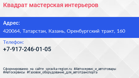 Квадрат, мастерская интерьеров по адресу 420064, Татарстан, Казань, Оренбургский тракт, 160 в дальнейшем Организация, размещена в следующих категориях: