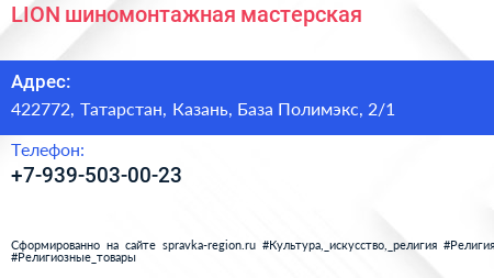 LION, шиномонтажная мастерская по адресу 422772, Татарстан, Казань, База Полимэкс, 2/1 в дальнейшем Организация, размещена в следующих категориях: