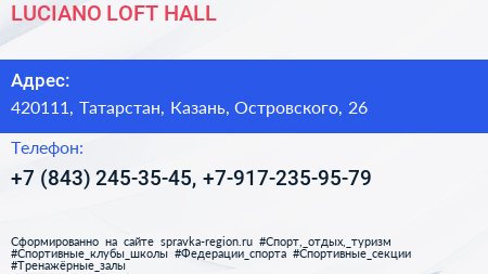 LUCIANO LOFT HALL по адресу 420111, Татарстан, Казань, Островского, 26 в дальнейшем Организация, размещена в следующих категориях: