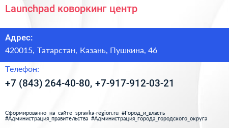 Launchpad, коворкинг-центр по адресу 420015, Татарстан, Казань, Пушкина, 46 в дальнейшем Организация, размещена в следующих категориях: