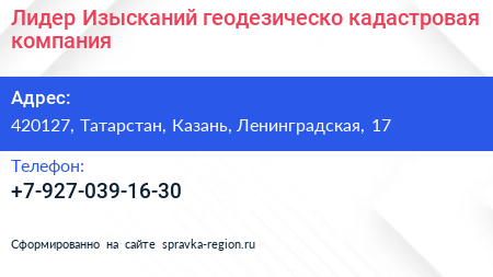 Лидер Изысканий, геодезическо-кадастровая компания по адресу 420127, Татарстан, Казань, Ленинградская, 17 в дальнейшем Организация, размещена в следующих категориях:
