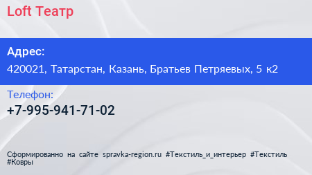 Loft Театр по адресу 420021, Татарстан, Казань, Братьев Петряевых, 5 к2 в дальнейшем Организация, размещена в следующих категориях: