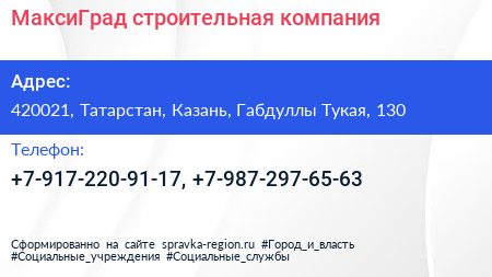 МаксиГрад, строительная компания по адресу 420021, Татарстан, Казань, Габдуллы Тукая, 130 в дальнейшем Организация, размещена в следующих категориях: