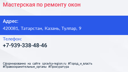 Мастерская по ремонту окон по адресу 420081, Татарстан, Казань, Тулпар, 9 в дальнейшем Организация, размещена в следующих категориях: