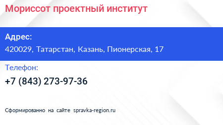 Мориссот, проектный институт по адресу 420029, Татарстан, Казань, Пионерская, 17 в дальнейшем Организация, размещена в следующих категориях: