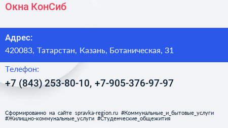 Окна КонСиб по адресу 420083, Татарстан, Казань, Ботаническая, 31 в дальнейшем Организация, размещена в следующих категориях: