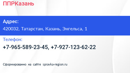 ППРКазань по адресу 420032, Татарстан, Казань, Энгельса, 1 в дальнейшем Организация, размещена в следующих категориях: